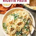 This creamy vegan ricotta pasta features luscious homemade dairy-free ricotta, fresh spinach, and a squeeze of lemon. It’s simple to make, decadent, and full of bright, fresh flavor.